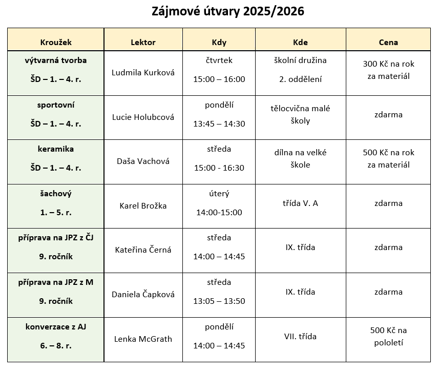 Kroužky budou podle zájmu žáků fungovat většinou od října 2025 do konce května 2026.