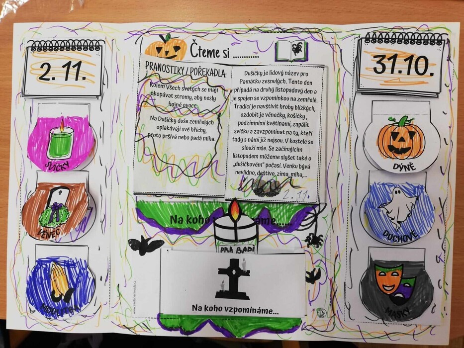 Ve 3. A jsme si povídali o obou svátcích. Ten český je jednoznačně Památka zesnulých. Celé dopoledne jsme však věnovali oběma svátkům. Někteří žáci přišli v maskách. Vyráběli jsme lapbook, ve kterém si můžeme tyto svátky kdykoliv připomenout. Hodně nás bavilo vyrábění duchů a mumií, ale i venkovní halloweenská stezka. Věřím, že každý si našel, co ho baví. Dopoledne jsme si opravdu užili. Mgr. L. Louženská, tř. učitelka