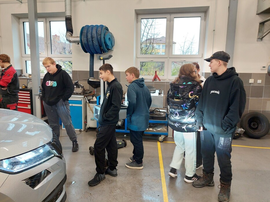 Polovina žáků IX. třídy se ve středu 19.11. zúčastnila projektového dne na Střední škole automobilní v Holicích. Žáci si vyzkoušeli některé technické dovednosti jako např. seřizování světel nebo kalibraci kamery na čelním skle. Seznámili se s asistenčními systémy nových vozů, vyzkoušeli jízdu v ve Škodě Enyaq a nahlédli pod kapotu. Největším lákadlem bylo usednutí do nových aut a objevování různých technických vychytávek.