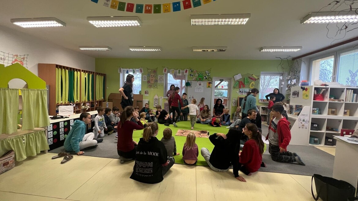 Mnozí z nás si jistě pamatují na svá školková léta i na to, jak se jim po obědě nechtělo spát. Co by za to teď dali. A protože i šesťáci si chtěli nostalgicky zavzpomínat, vydali jsme se v úterý 26. 11. 24 do Mateřské školy v Uhersku, kam nás pozvala paní ředitelka Mgr. Tereza Kaplanová.
