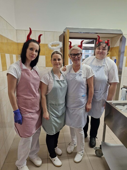 Společnou fotografii si čerti s anděly a Mikulášem pořídili i s kuchařkami školní jídelny, asi aby mohli v budoucnu vzpomínat na naše školní obědy.