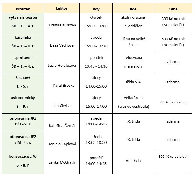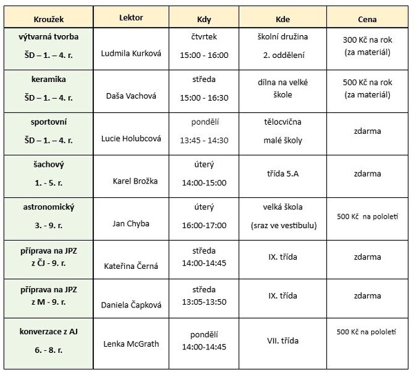 Zaměstnanci naší školy zajišťují tyto kroužky: